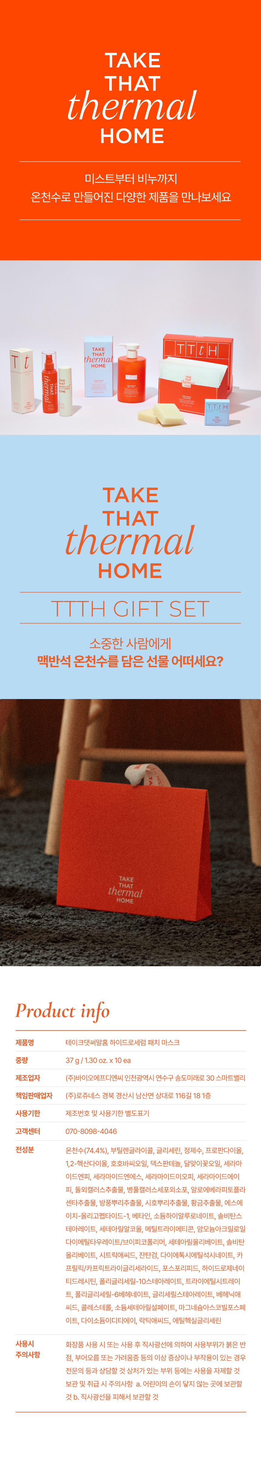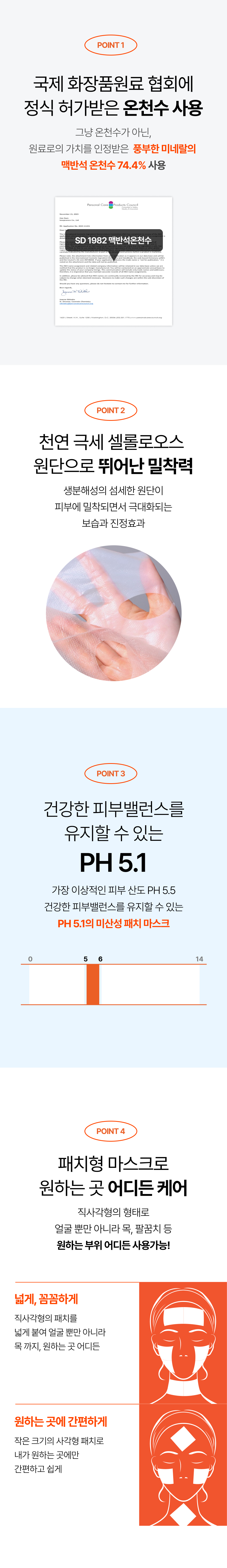 맥반석 암석 지층에서 용출되는 다양한 미네랄이 함유된 온천수 74.4% 와 피부진정 및 보습에 도움을 주는 성분들을 함유한 세럼을 생분해성 셀룰로오스 원단에 침적하여 보습이 필요한 부위에 집중관리 할 수 있는 세럼 패치 마스크로 촉촉한 피부관리에 도움을 줍니다.